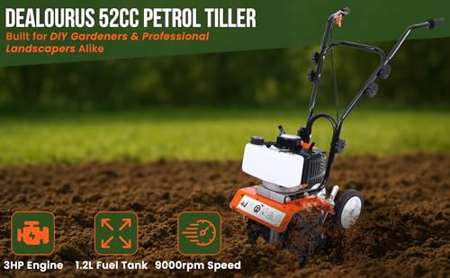 - Dealourus - Motoculteur avec moteur à essence 52 cm³ - 3 CV- 2 temps - Léger, compact et puissant - Poignées sûres - Conçu pour être durable et robusteCe motoculteur à essence est une machine puissante de haute qualité, parfaite pour les amateurs ou les paysagistes professionnels. Il dispose de 4 roues dotées de 4 dents chacune, et d’un moteur haute puissance de 3 CV. Les dents peuvent s’enfoncer de 15 cm dans le sol, ce qui rend cet outil idéal pour entretenir les pelouses, les bordures et les potagers. Caractéristiques : équipé d'un moteur à essence de 52 cm³ avec une capacité de réservoir de 1,2 L et une vitesse maximale de 9000 tr/min, et de 4 roues dentées puissantes pour cultiver le sol. Vous pouvez facilement retourner une terre très dure avec cet outil de jardinage à essence léger. Léger / facile à transporter et à utiliser : poignée de type guidon de vélo pour une utilisation facile, assemblage durable de l'embrayage et de la boîte de vitesses, protection de sécurité vérifiée pour protéger l'opérateur ; appareil léger avec deux roues robustes pour une mobilité et une maniabilité facilitées. Caractéristiques techniques : moteur : 52 cm³. Largeur au sol : 28 cm. Largeur de l’aérateur : 29 cm. Hauteur du corps : 45 cm. Diamètre des roues arrière : 18 cm. Couleur : noir et orange. Système de démarrage : enrouleur. Hauteur des poignées à partir du bas de la roue : 98 cm environ. Poids net : 16,5 kg sans accessoires supplémentaires. - Toutes les pièces de rechange sont facilement disponibles.